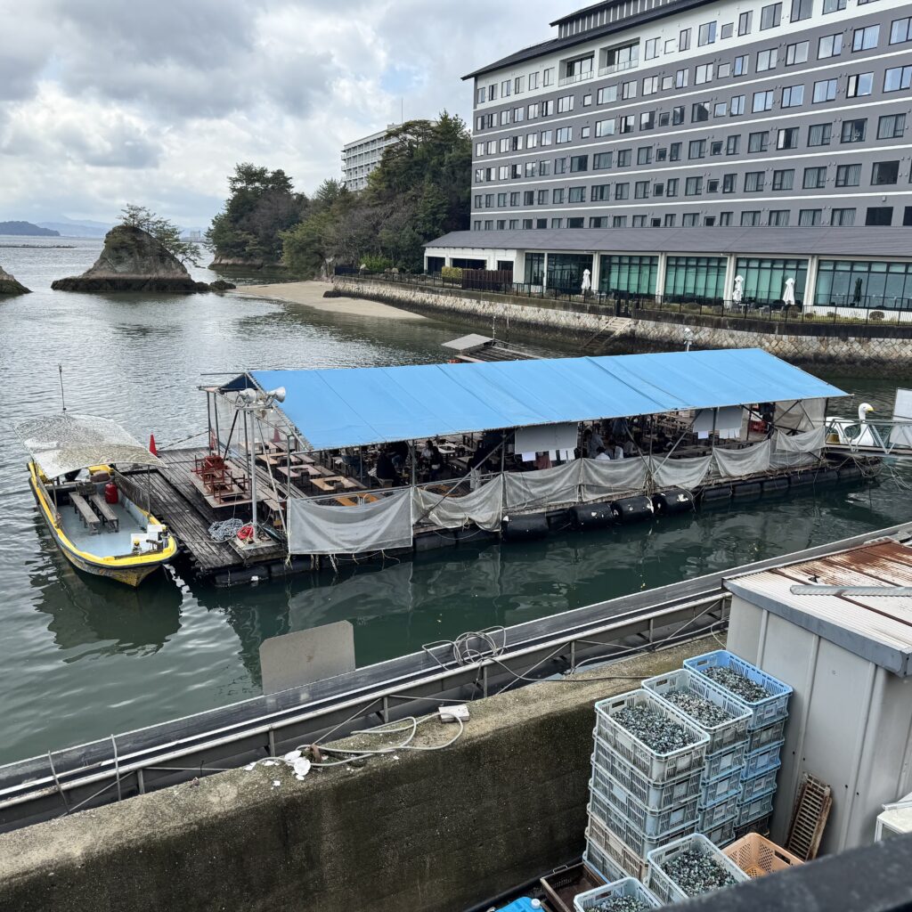 島田水産は1688年創業の広島かきの生産者。嚴島神社沖の波の穏やかな漁場で牡蠣の養殖を行っています。取材に伺った日は、最初雨が降っていましたが、雨が止んで青空が見えてくると水面がキラキラと輝いていました。遠くに厳島神社の鳥居も見える景観豊かな場所が漁場です。現在は約100台の筏で牡蠣を育てつつ、カキ小屋や、牡蠣の水揚げ体験や遊覧など観光事業も展開しています。漁場はこの厳島神社沖と江田島沖があるとのこと。気候や気温などに合わせて牡蠣筏を移動させているとのこと。この移動が大変で、筏を移動させるプロの業者に頼んでいるとのこと。そんなプロがいらっしゃるなんて!すごいですね。