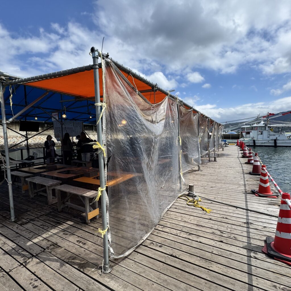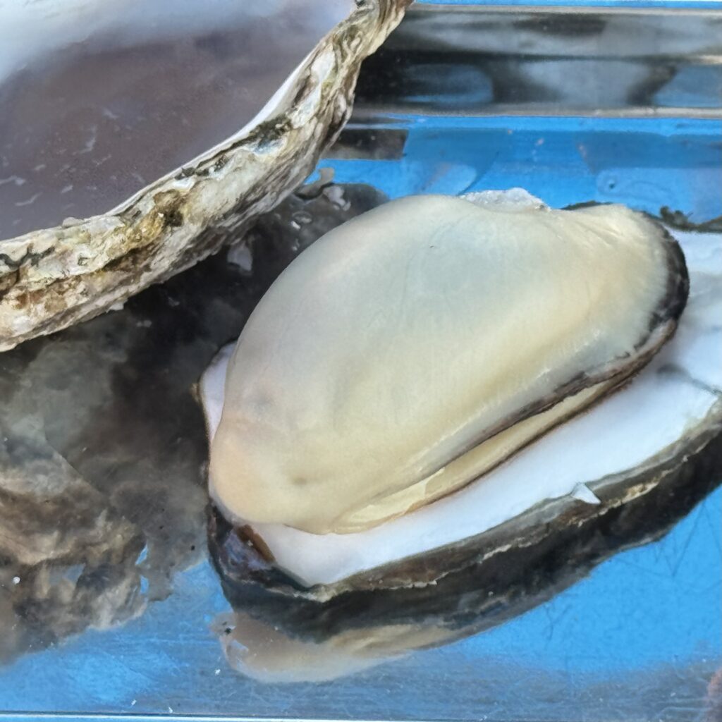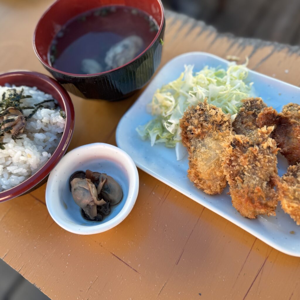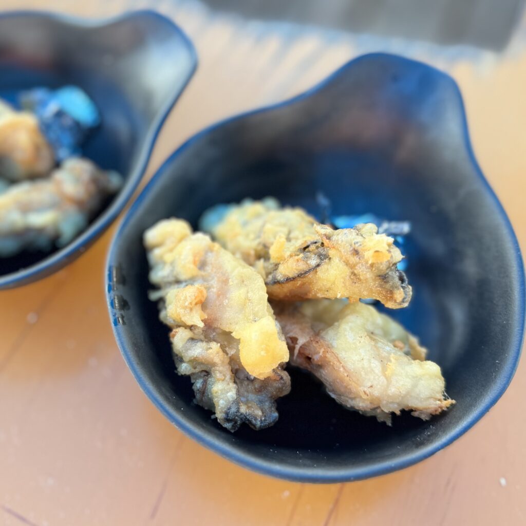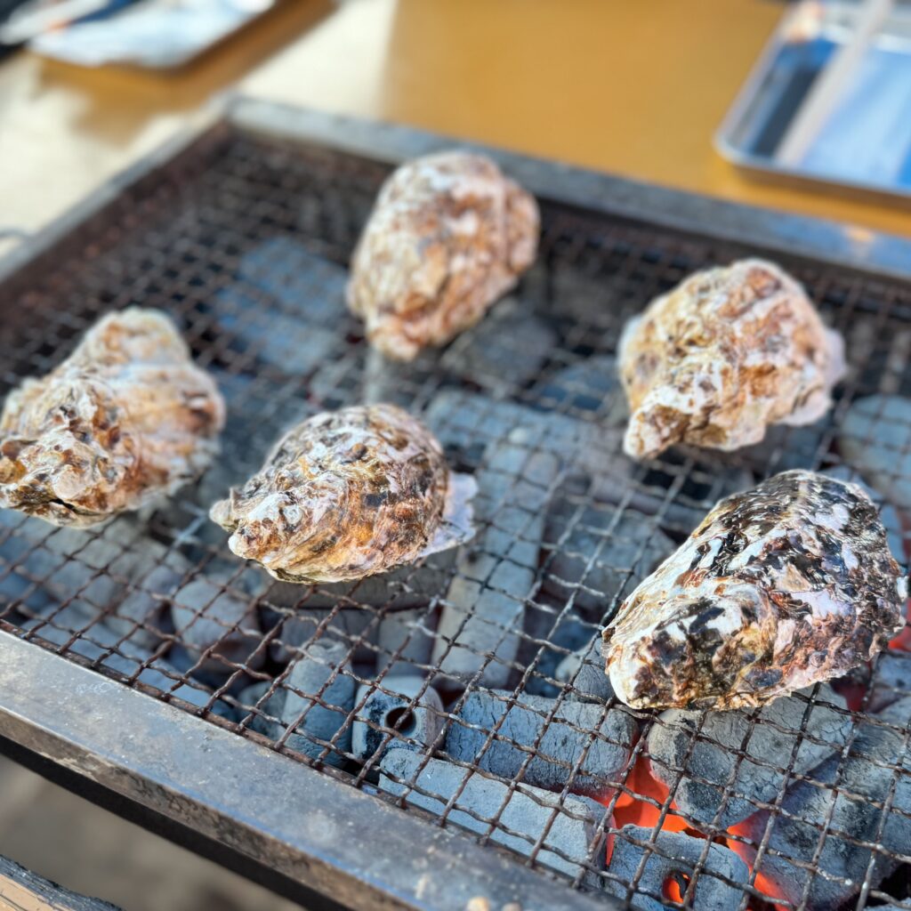 取材をさせていただいた後、かき小屋で牡蠣料理をいただきました。今回はひろしま食の手帖編集部のメンバーと広島文教女子大学の学生と伺ったので、いろいろ注文してシェアできました!島田専務おすすめの「牡蠣の天ぷら」は本当に美味しかった。牡蠣といえばフライ!だと思っていましたが、天ぷらにすると衣はカラッと、牡蠣はジューシーで旨味をしっかり感じられます。フライより牡蠣感が強い気がしました。殻付きの牡蠣は網の上で蒸し焼きに!特大の牡蠣が見るからにプリップリッでした。