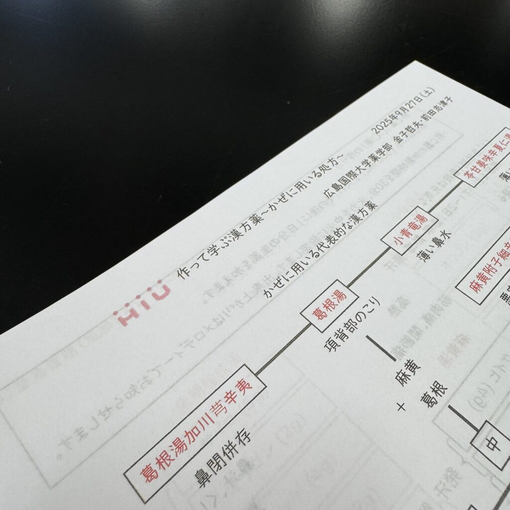 今回のテーマは「作って学ぶ漢方薬」実際にそれぞれの生薬について学びながら、漢方薬を煎じました。すでに広島国際大学の先生方がほぼご準備してくださっていたので、混ぜたり煎じたりするだけでしたが、さらに知識を深めることができました。風邪の漢方薬についてもレクチャーしていただきました。