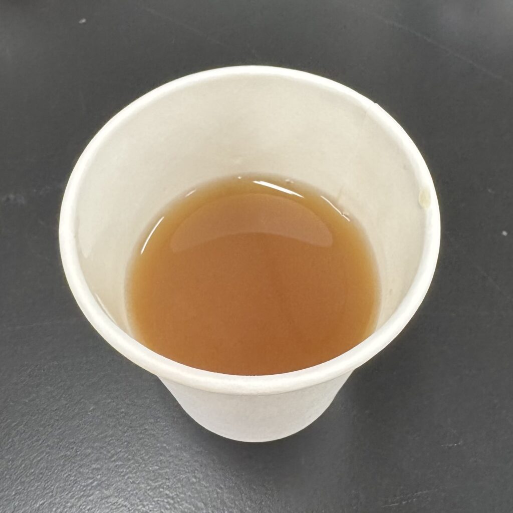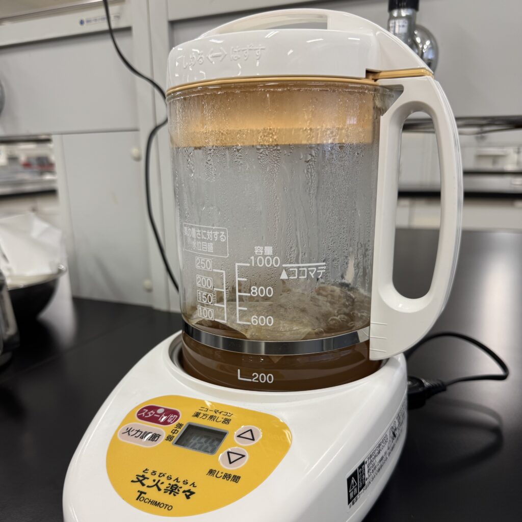 今回は班ごとに分かれて、漢方薬をそのまま煎じたものとお茶パックに入れて煎じたものに分けて作りました。そのまま煎じたものは色も濁っていて良くも悪くも「濃い」感じでした。お茶パックを使うと、まずゴミに捨てる時とても楽です。そして割と澄んだ煎じ汁になっていました。先生曰く、煎じ方によっての効能の違いについてはあまりないのでは?とのことでした。煎じる時間でも変わってくるので比較は難しいのかなと思います。まずは続けられる飲み方がいいのではと思いました。