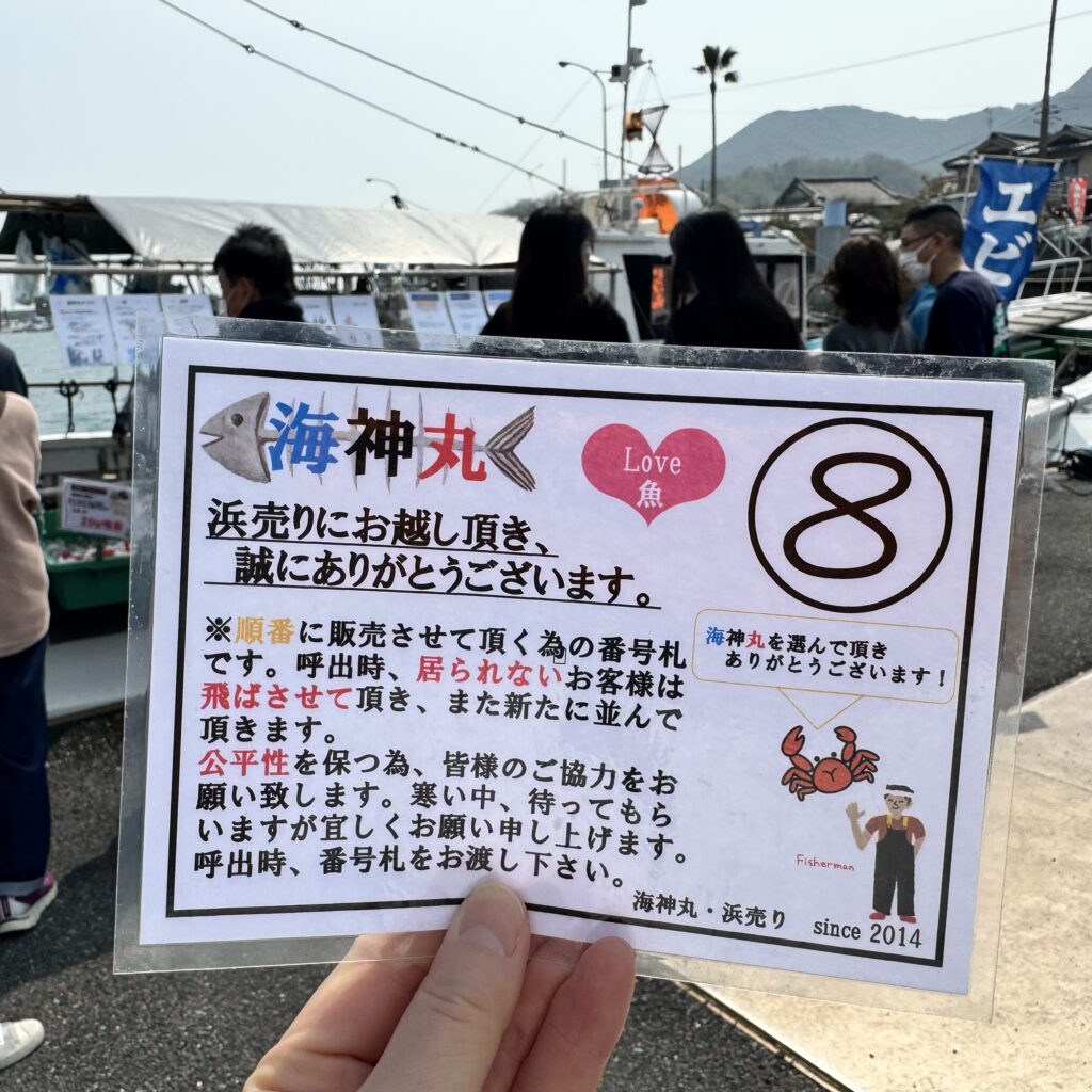 初めて伺ったので、時間までウロウロしていたが…なんて勿体無いことをしていたのでしょうか?(笑)浜売りとは漁船ごとに売る形式。魚の並べ方は漁船によってさまざま。丘にあげて魚の種類ごとにケースなどに入れて売ったり、桟橋では漁船の上で売ったり…日によるが、この日は約6つの漁船で売っていた。(岸の向こう側でもやっていたそうだが、そこまでは行かなかった)そして、売り方もさまざま。購入希望者と漁船の方でジャンケンしたり、整理券を配って順番に購入するなど。早く到着していたのに〜〜。整理券取っておけば良かった!ゆっくり漁船に向かったら、整理券番号は⑧…隣の方と話をしたら、もう目玉の魚は買えないかも!と…(泣)